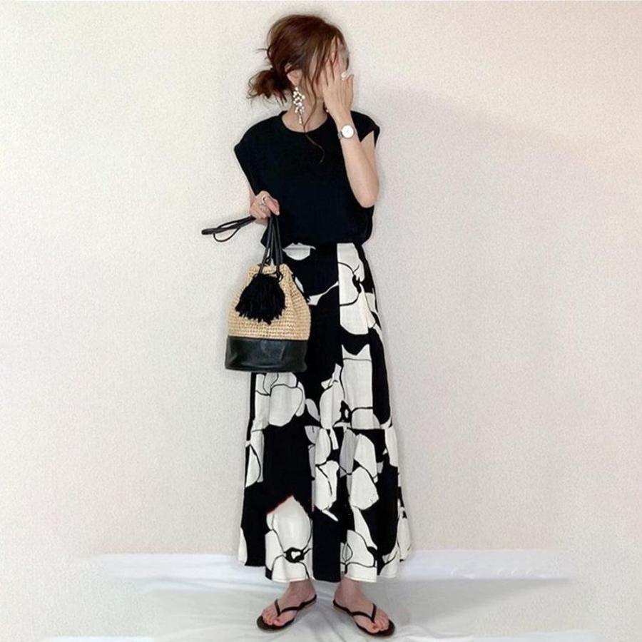 上品に個性を印象づけるモノトーンのフラワー リーフ柄 セットアップでワンピース風な着こなし イトキンオンラインストア